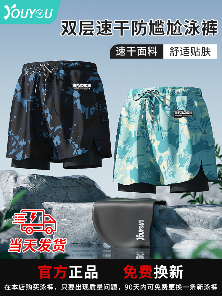 수영 트렁크 남성용 속건성 대형 당황 방지 2023 새로운 전문 더블 레이어 비치 팬츠 수영복 장비 풀 세트