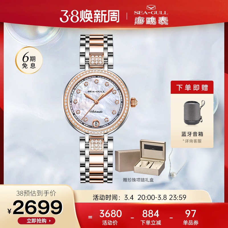 갈매기 시계 여성용 기계식 시계 1112 라이트 럭셔리 틈새 진주 다이아몬드 세트 패션 여성용 시계 여자 친구 선물