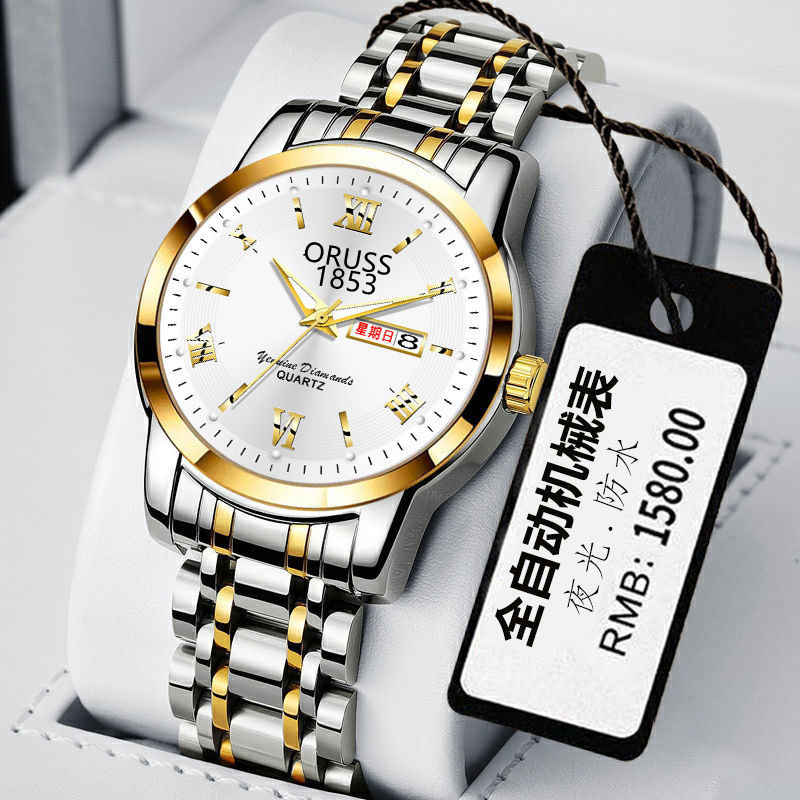 [저가 픽업] 스위스 자동 기계식 시계 소박한 골드 더블 캘린더 발광 방수 남성용 브랜드 시계
