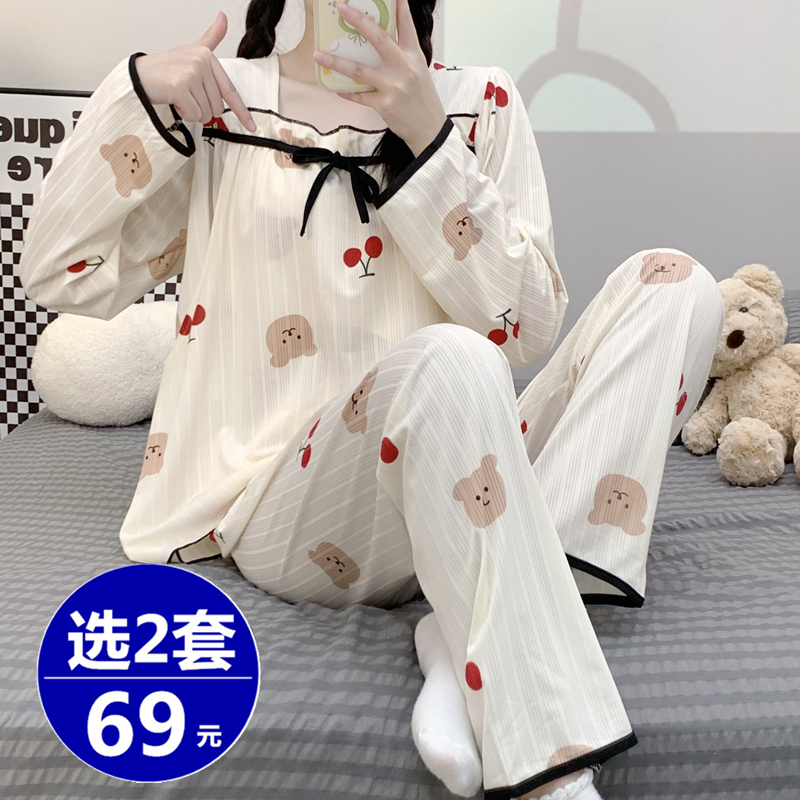 임산부 잠옷 봄과 가을 월간 의류 여름 얇은 면화 산후 모유 수유복 가을과 겨울 모델 투피스 슈트 체리 베어