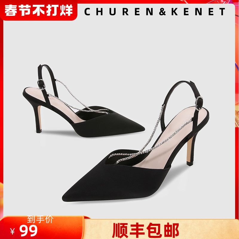 봄 새로운 숙녀 체인 포인트 하이힐 샌들 전문 작업 신발 인터뷰 공식 여름 새틴 싱글 슈즈
