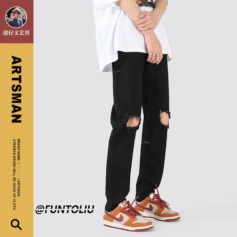 검은 깨진 구멍 청바지 남자 가을 느슨한 스트레이트 바지 아메리칸 하이 스트리트 분위기 복고풍 소년 캐주얼 바지