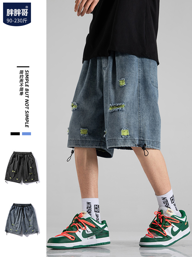 브로큰 홀 데님 반바지 하이 스트리트 트렌드 스트레이트 팬츠 루즈 5 분 대형 여름 바지의 남성용 여름 얇은 섹션