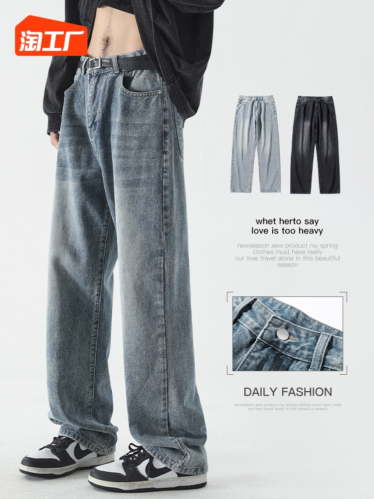 아메리칸 청바지 남성 여름 얇은 섹션 워싱 및 오래된 하이 스트리트 스트레이트 루즈 조수 소년 와이드 레그 롱 팬츠