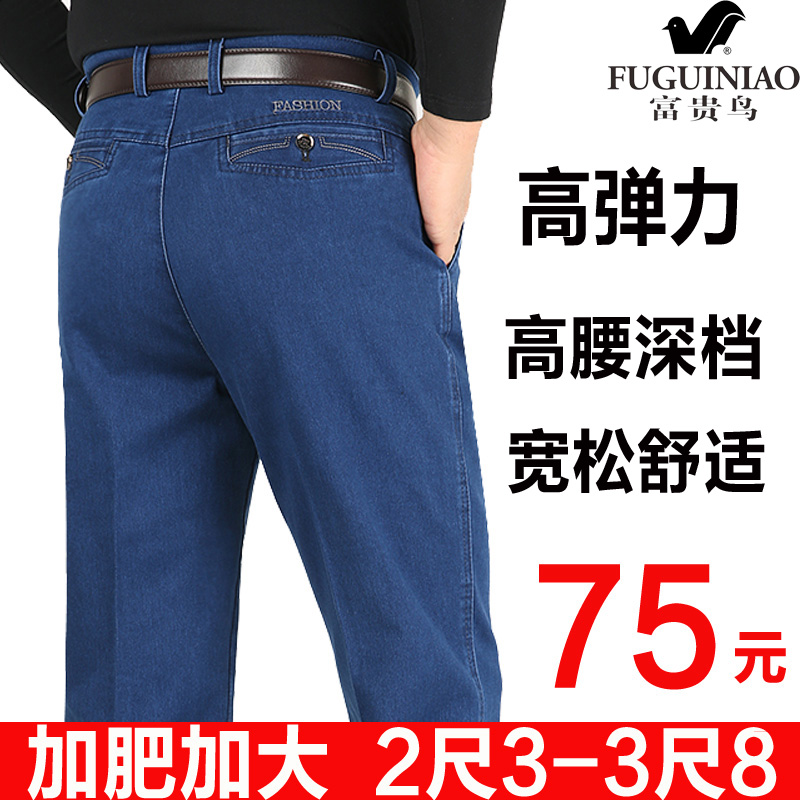 중년 및 노인 고탄성 청바지 남성 바지는 하이 웨이스트 느슨한 딥 기어 뚱뚱한 남자 아버지 바지 가을과 겨울 두꺼운 모델의 크기를 늘립니다.