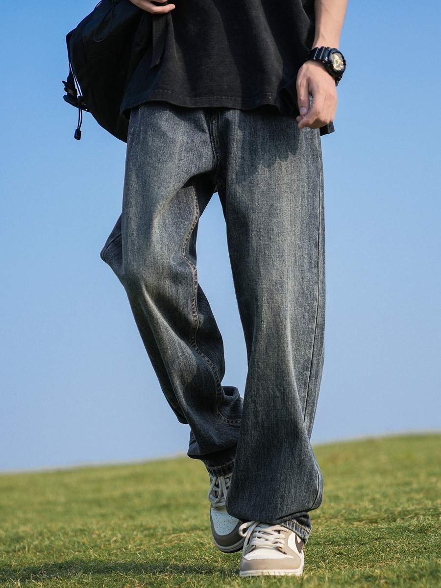 홍콩 차이 문학 남성 청바지 남성 여름 얇은 복고풍 소년 스트레이트 바지 느슨한 캐주얼 바지 남성 모델
