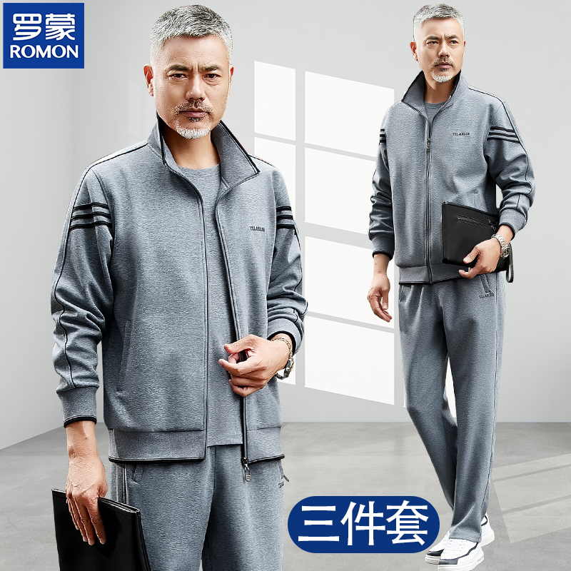 로모 아버지 회색 스포츠웨어 정장 남성 봄과 가을 새로운 중년 및 노인 남성 캐주얼 3 피스 정장 큰 사이즈
