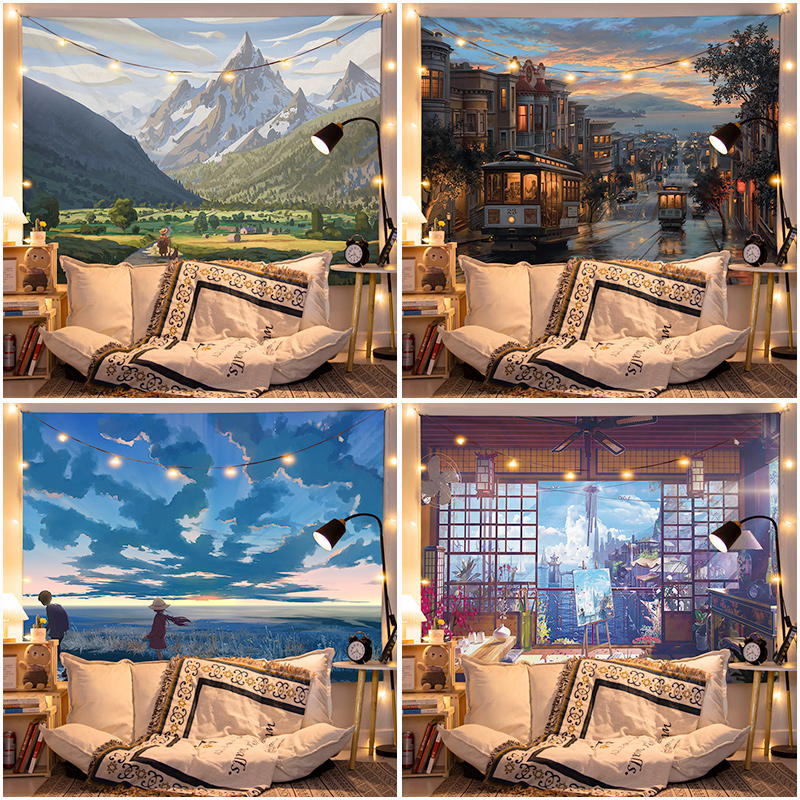 미적 일본 풍경 배경 천 침실 방 침대 옆 벽 기숙사 장식 벽 천 매달려 천 그물 빨간색