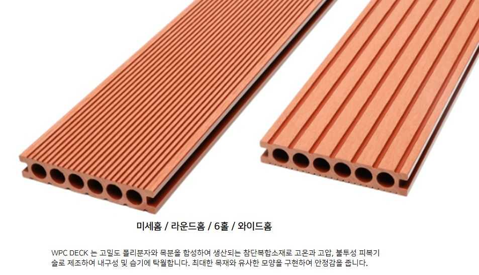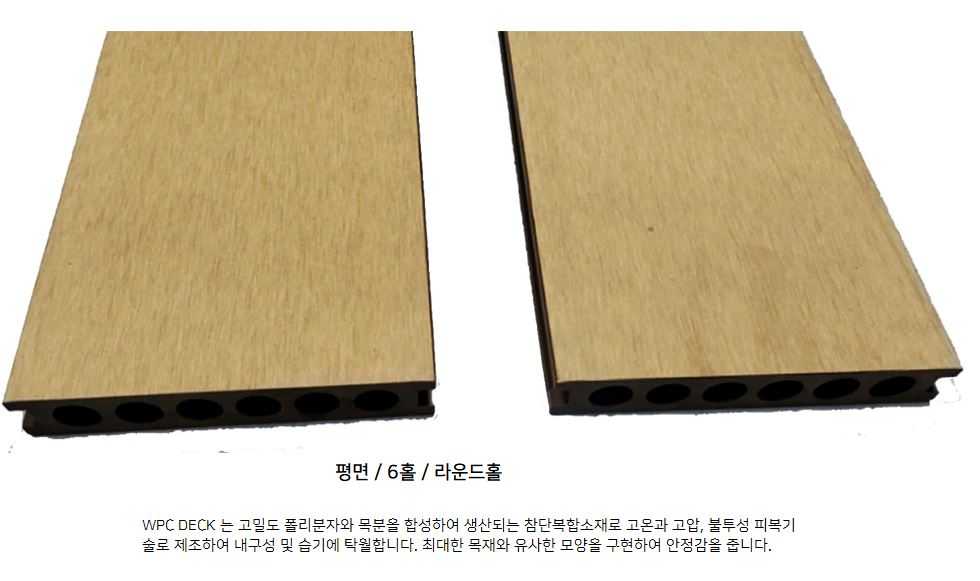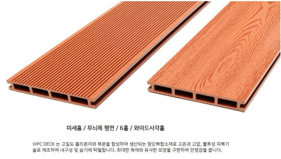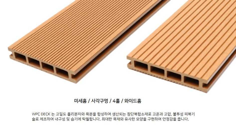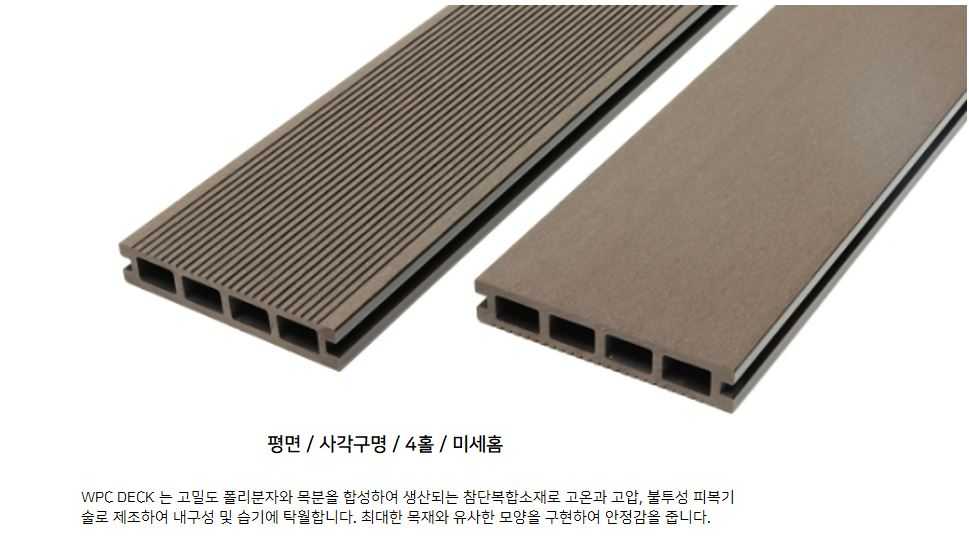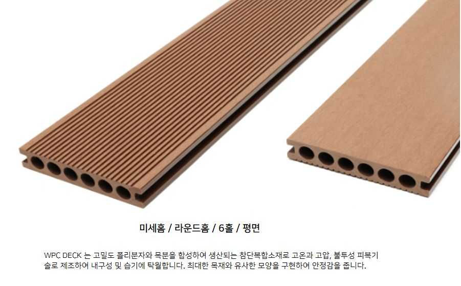 WPC DECK 는 고밀도 폴리분자와 목분을 합성하여 생산되는 첨단복합소재로 고온과 고압, 불투성 피복기술로 제조하여 내구성 및 습기에 탁월합니다. 최대한 목재와 유사한 모양을 구현하여 안정감을 주고 유지관리 없이 반영구적 사용가능합니다.