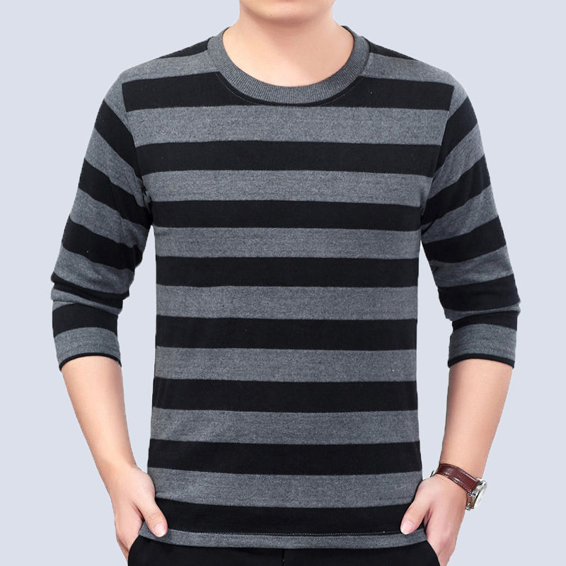남성 긴팔 티셔츠 라운드 넥 봄 바닥 셔츠 코튼 스트라이프 니트 셔츠 중년 캐주얼 다용도 가을상의