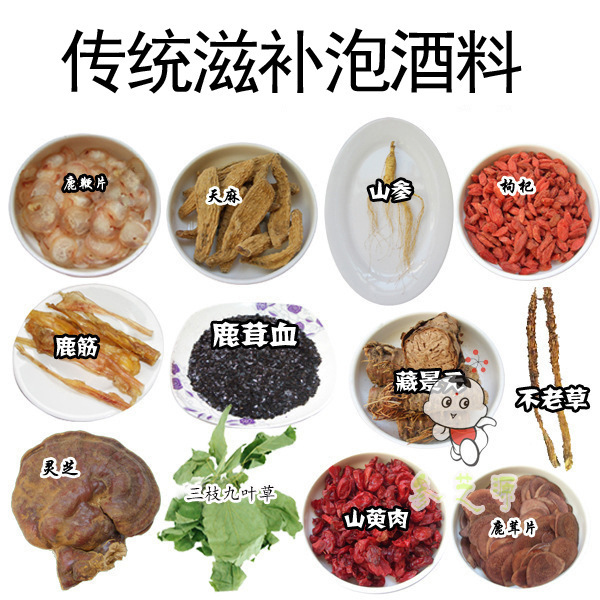 1 ginseng, 2 non -old grass, 10 grams of blood antler blood, 10 grams of velvet chip tablets, 30 grams of wolfberry, 25 grams of mandarin, 5 grams of deer whip tablets, 25 grams of deer tendon, 15 grams of Gastrodia, Snow lotus, safflower, Achyranthes, Jeongzi, Jin Yingzi, Suoyang, Sanzhi Jiuye Grass, Black Old Son, Astragalus.